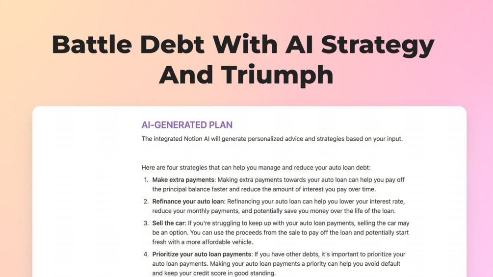 Join the countless individuals who have successfully eliminated their debt and achieved financial freedom using our Notion Templates. Our plan is backed by AI, ensuring you get the best possible advice and support throughout your journey.