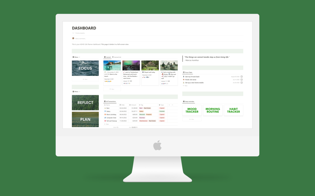 Notion is great for many things, including building daily planners, weekly planners, habit trackers, goal setting, and occasional brain dump. With a beautiful but noisy adult ADHD brain - you might find it very hard to actually complete your To-Do lists regardless of how you organize them. If you tried other ADHD planners, you will find that this is the best ADHD monthly planner out of them all. It allows you to keep your personal planner in an organized manner, you'll be able to keep a bullet journal of your mood, keep an undated planner for your morning routine, track your finances, and more!