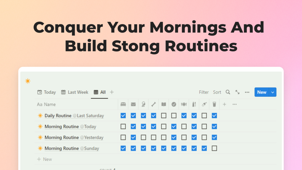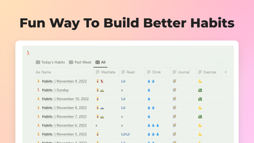 One of the best ways to set yourself up for success is to have a strong morning routine. This habit tracker will help you track your morning routine and make sure you're sticking to it. As you check off each task, you'll be able to see your progress and how well you're doing. With new recurring templates in Notion, you will have a new checklist automatically created each morning.