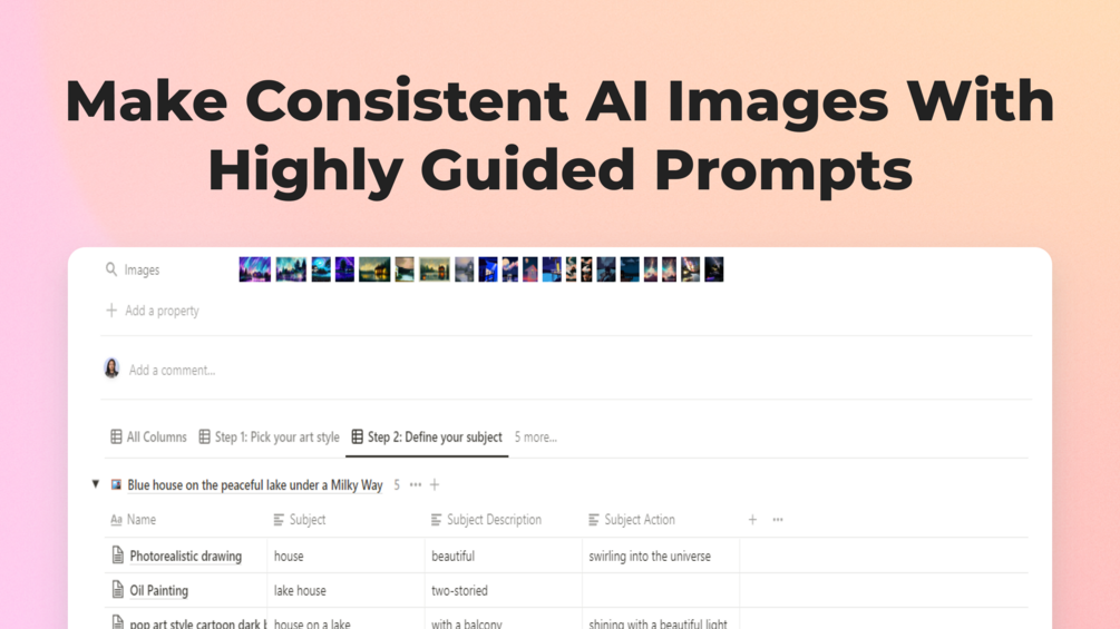 Do you need a constant flow of fresh creatives for your social media accounts? Create a prompt library with all the different variations of images and then just copy them into MidJourney or DALL-E 2 to generate new pictures.