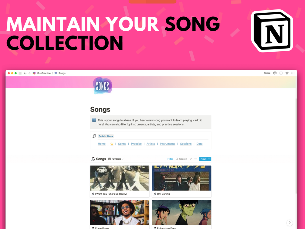 π΅ Track songs you want to learn - Heard a song you like, but don't have time to practice? Add it to a Songs dataset, and break it down by instruments later. How about storing all the tab scores of your favorite songs in one place?