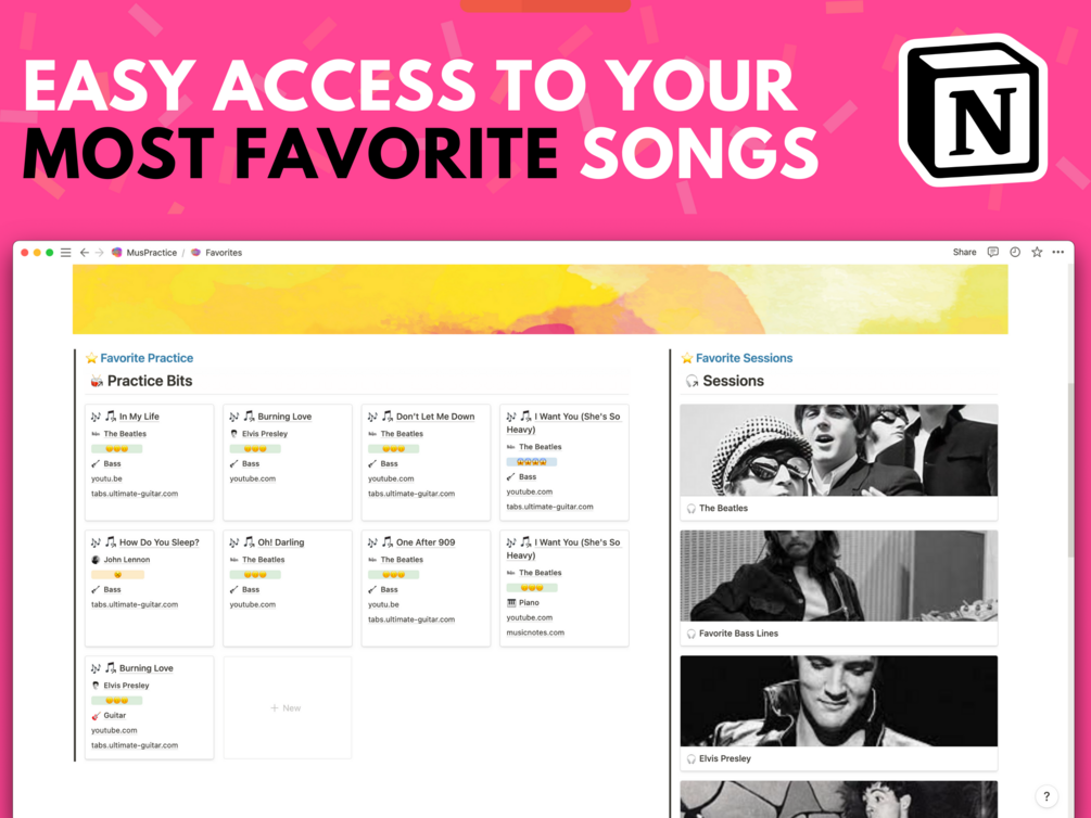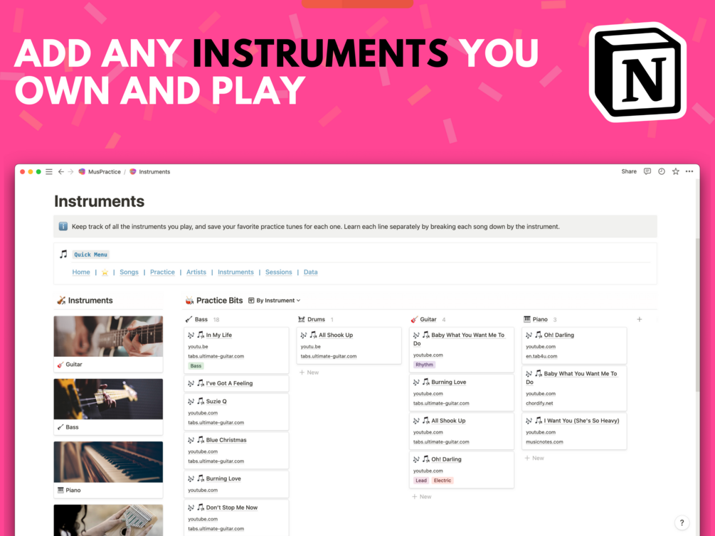 Keep track of your music practice with MusPractice. This template includes a Notion dashboard for tracking your guitar, bass, piano, and drum practice.