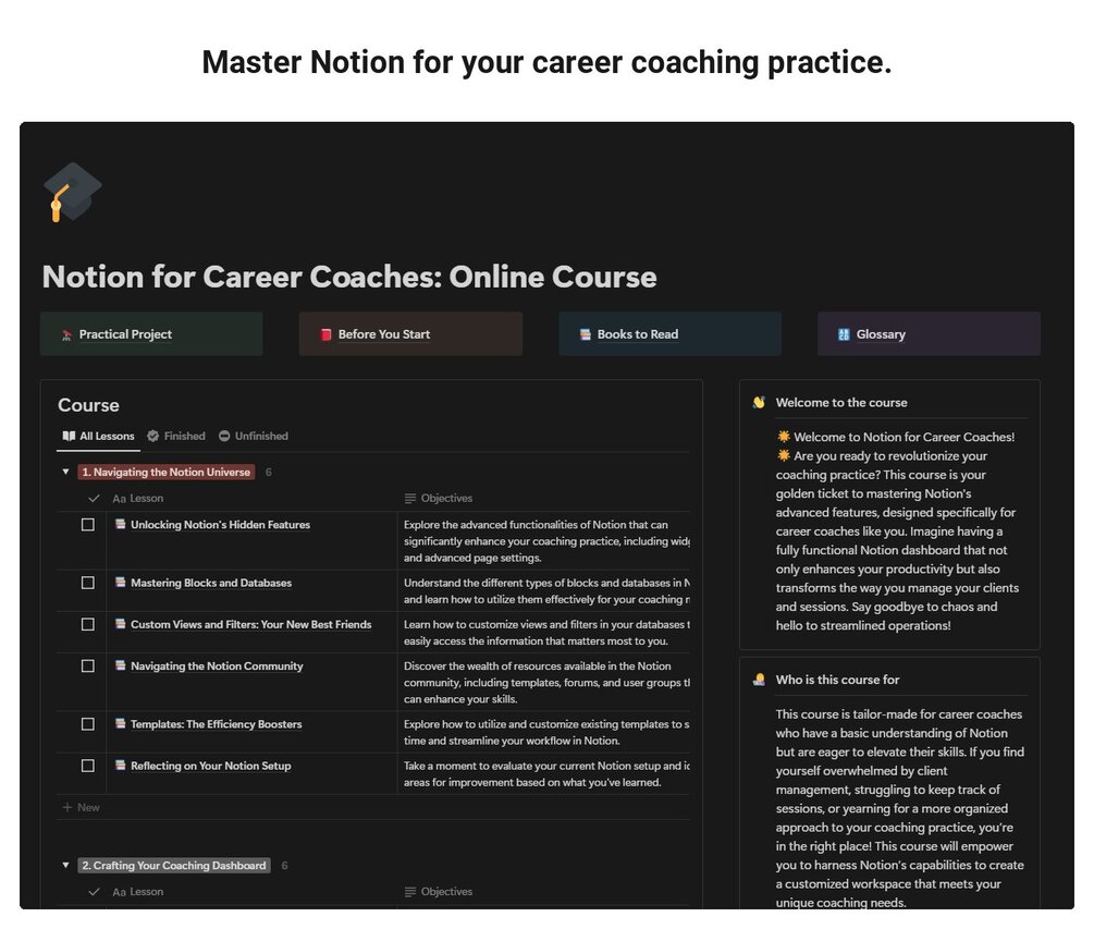 By the end of this course, you will master advanced Notion functionalities tailored for career coaching.