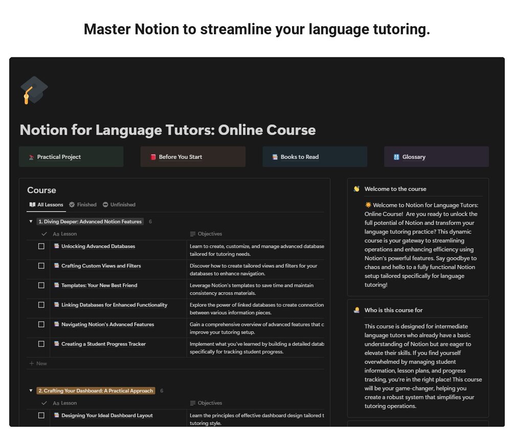 - - Assignments: Assignments will challenge you to apply your knowledge in practical ways, including the creation of your own Notion for Language Tutors Dashboard.