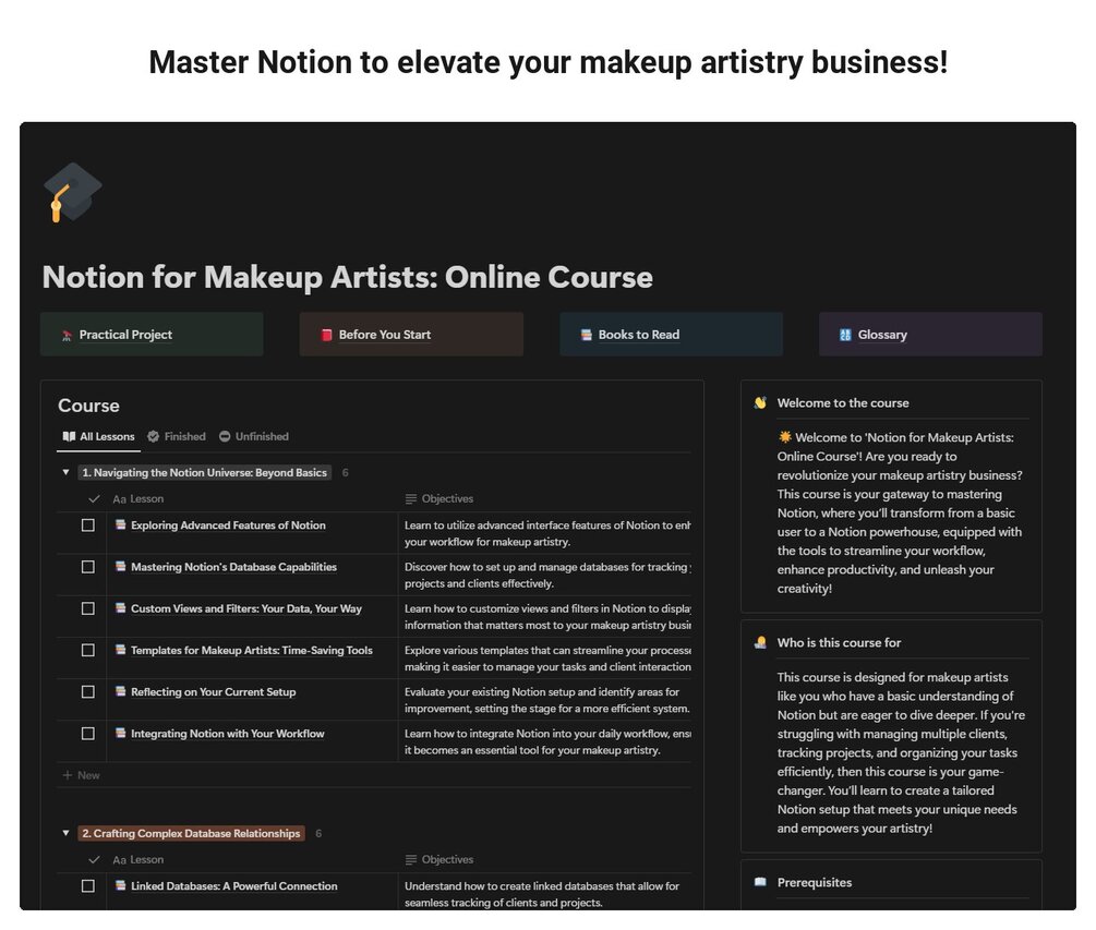 - - Practical Project: Your final project will involve developing a fully functional Notion setup tailored for your makeup artistry business.