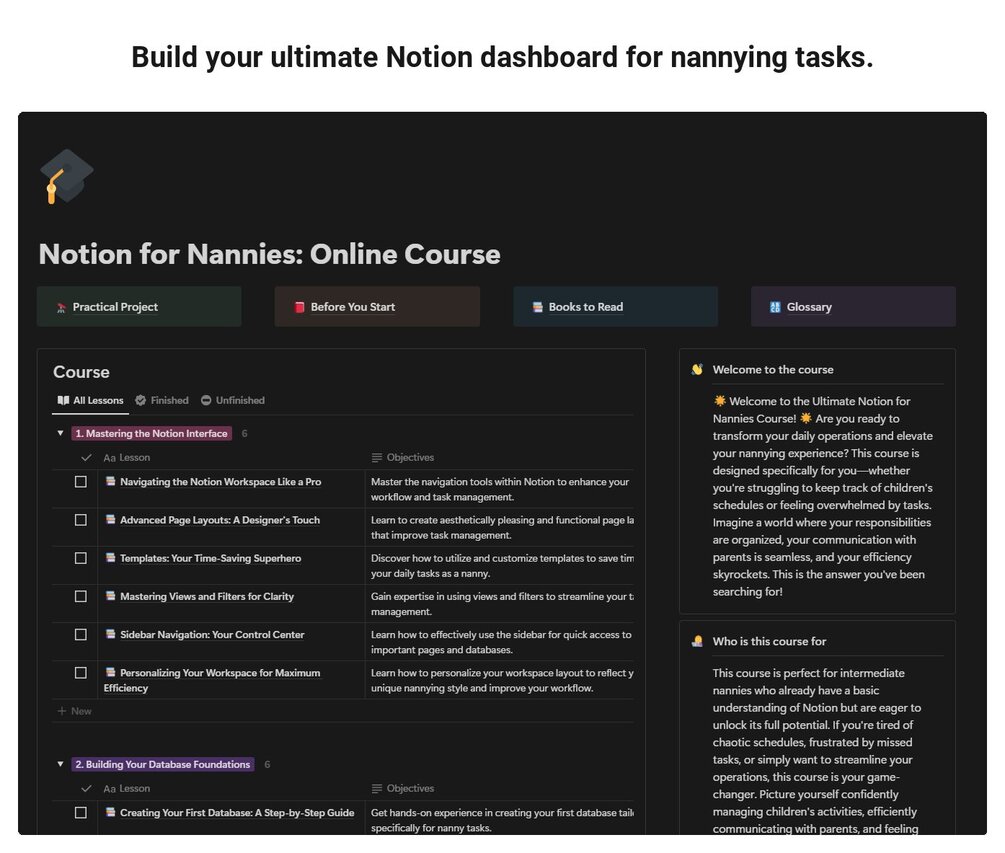 - - Practical Project: A comprehensive project where you'll create a fully functional Notion dashboard tailored for your nannying tasks.