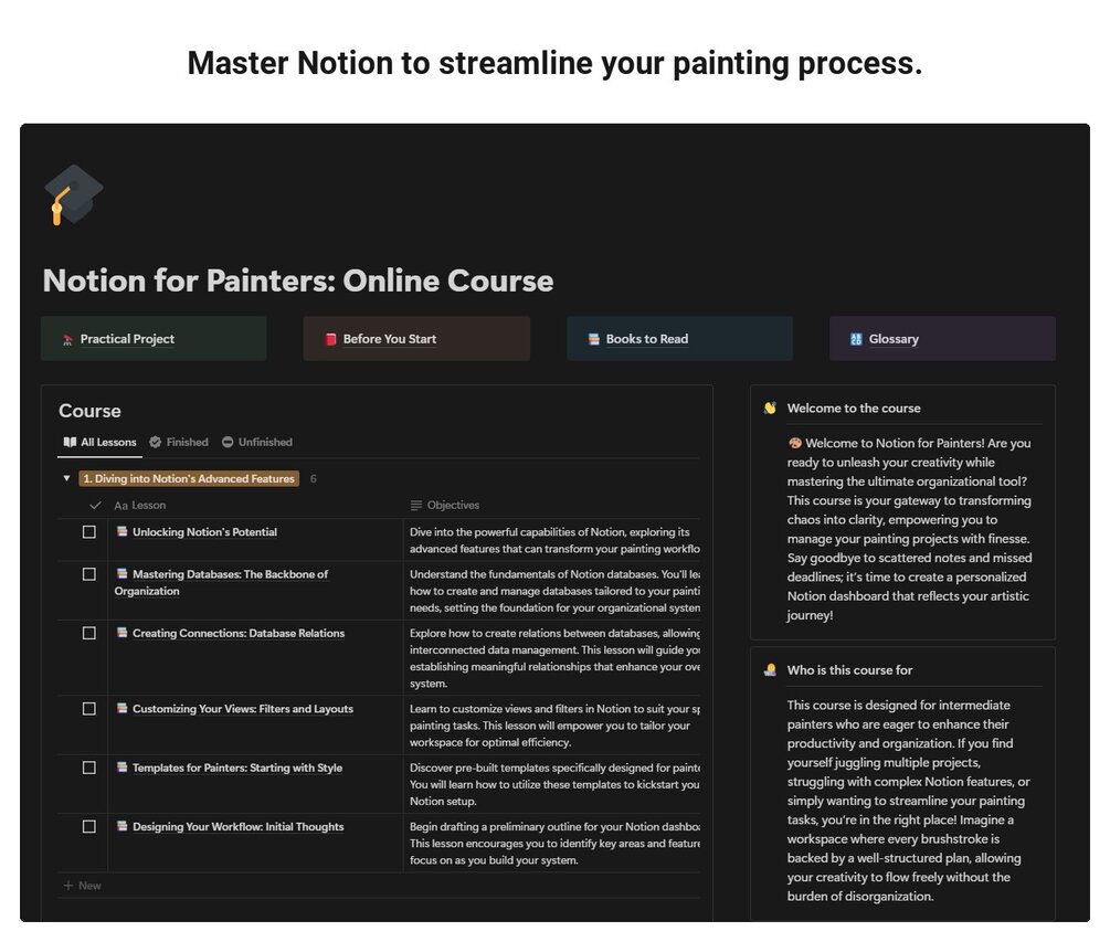 This course includes a rich array of modules designed to elevate your Notion skills and painting organization: