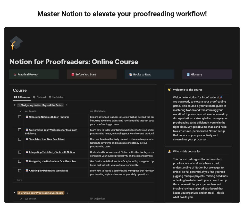 By the end of this course, you will master advanced Notion techniques that will transform your proofreading workflow.