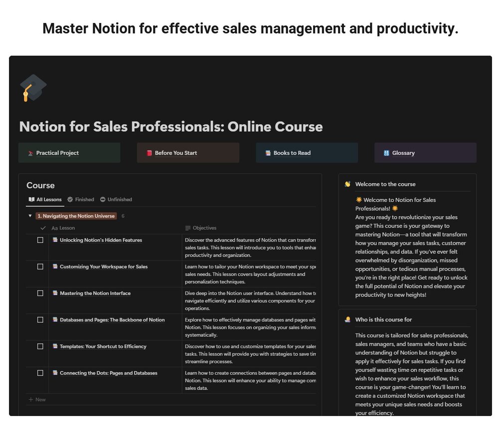 This course is packed with practical content designed to enhance your sales operations using Notion.