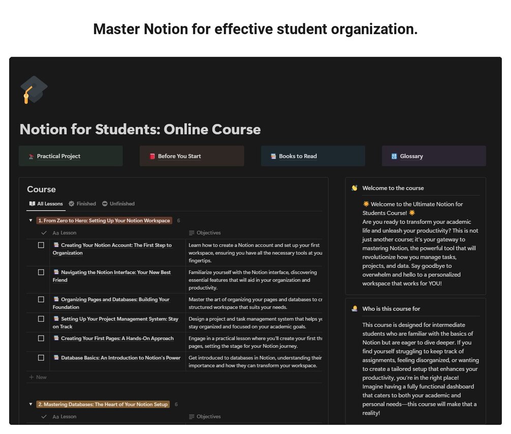 This course is tailored for students who already have a basic understanding of Notion and are eager to deepen their knowledge. If you're looking to create a personalized workspace that caters to your academic and personal needs, this course is perfect for you!