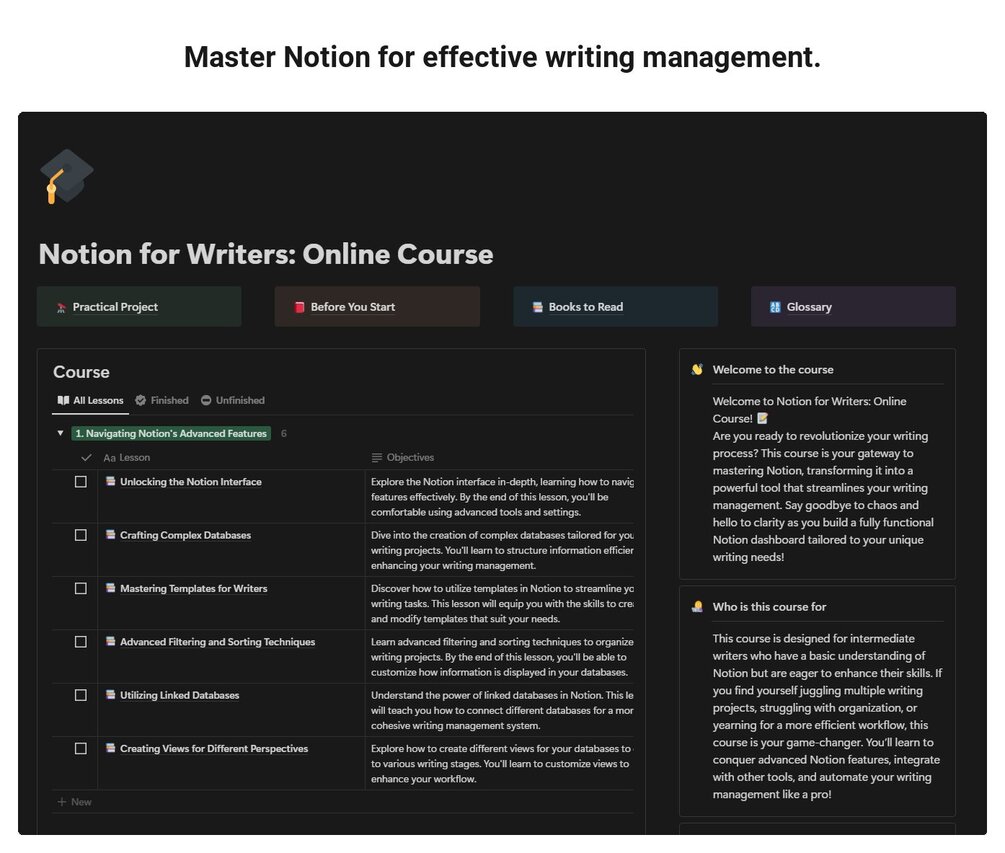 - - Assignments: Engage in practical assignments that will challenge you to apply your new skills, including creating your own Notion for Writers Dashboard.